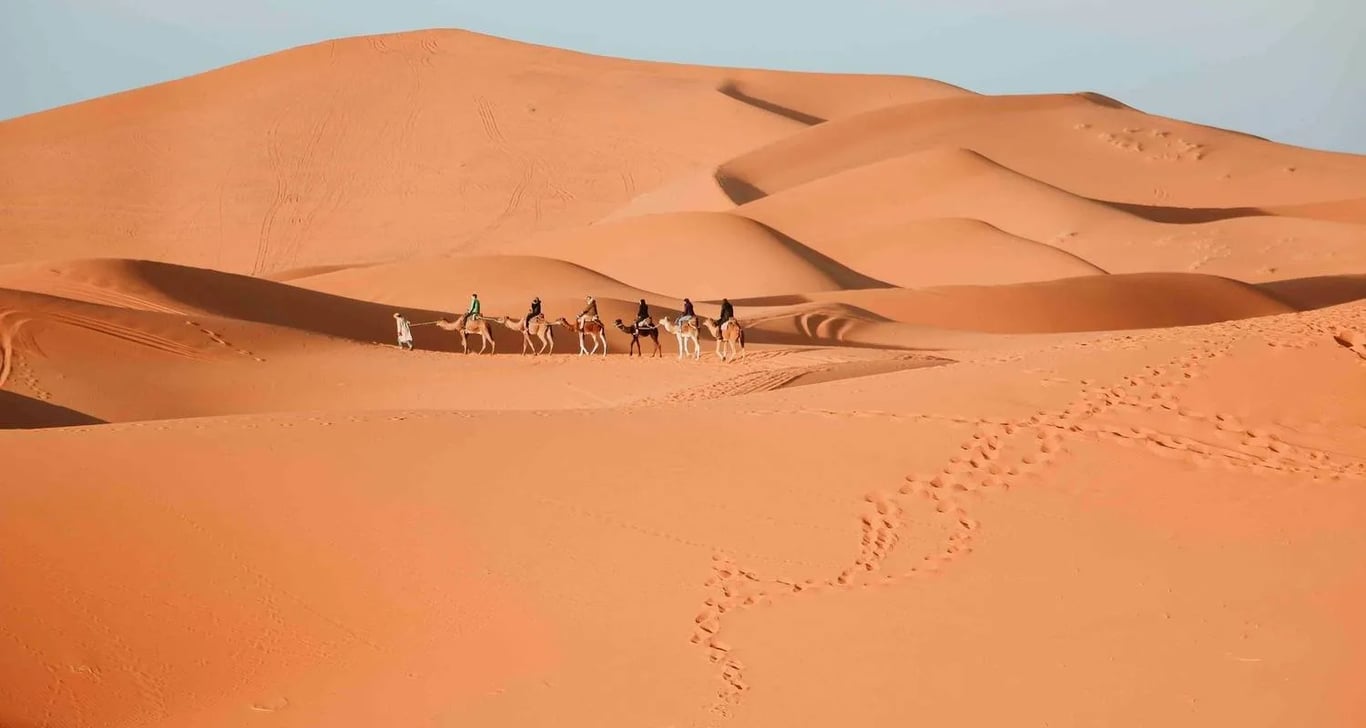 Traveling at 08h from Fez to Merzouga is a journey that takes you from the medieval city of Fez to the desert landscape of Merzouga, passing through the beautiful Middle Atlas Mountains and Ziz Valley, where you can see traditional Berber villages and stunning landscapes. Once in Merzouga, you will have the opportunity to experience the thrill of camel rideking and spend the night in a traditional desert base camp. You will cross the dunes and admire the sunset and the colors in perpetual evolution. After a traditional dinner with Berber rhythms, you will spend the night under the stars in a nomad tent in the middle of the desert.